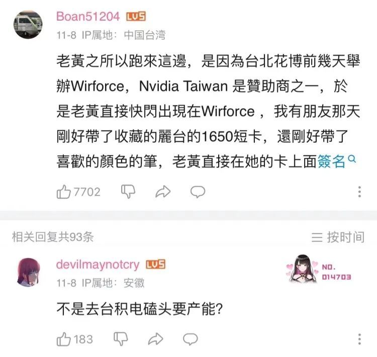 有人猜测老黄这次到台北是不是因为新品GeForce RTX 4090来紧急造访台积电的,不过很快有网友站出来“辟谣”了,说他来是参加Wirforce(一场电竞嘉年华活动)的,朋友还要到了老黄的签名。