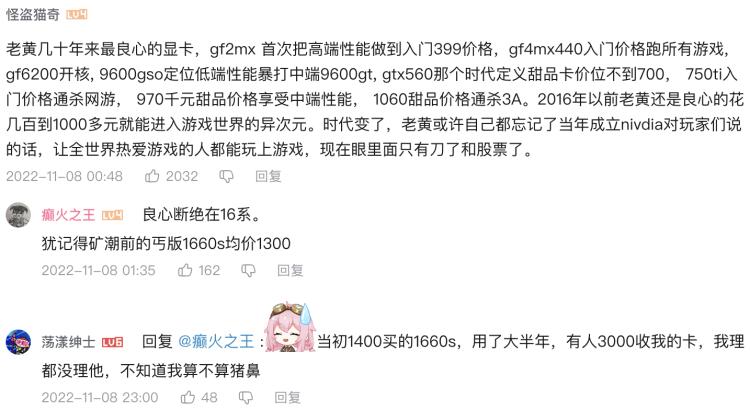 有人痛心疾首地评论,“老黄或许自己都忘记了当年成立NVIDIA对玩家们说的话,让全世界热爱游戏的人都能玩上游戏,现在眼里面只有刀了和股票了。”