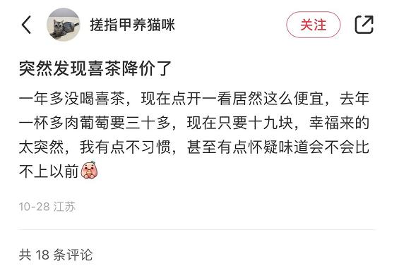 如此一来,部分老用户会诧异并质疑。小红书上的某博主最近就表示:突然发现喜茶降价了,我有点不习惯,甚至有点怀疑,味道会不会比不上以前。而未来第一次品尝喜茶的人,如果有高端饮品的消费需求,也很难去选择十几元一杯的喜茶,即便它品质可能如旧。