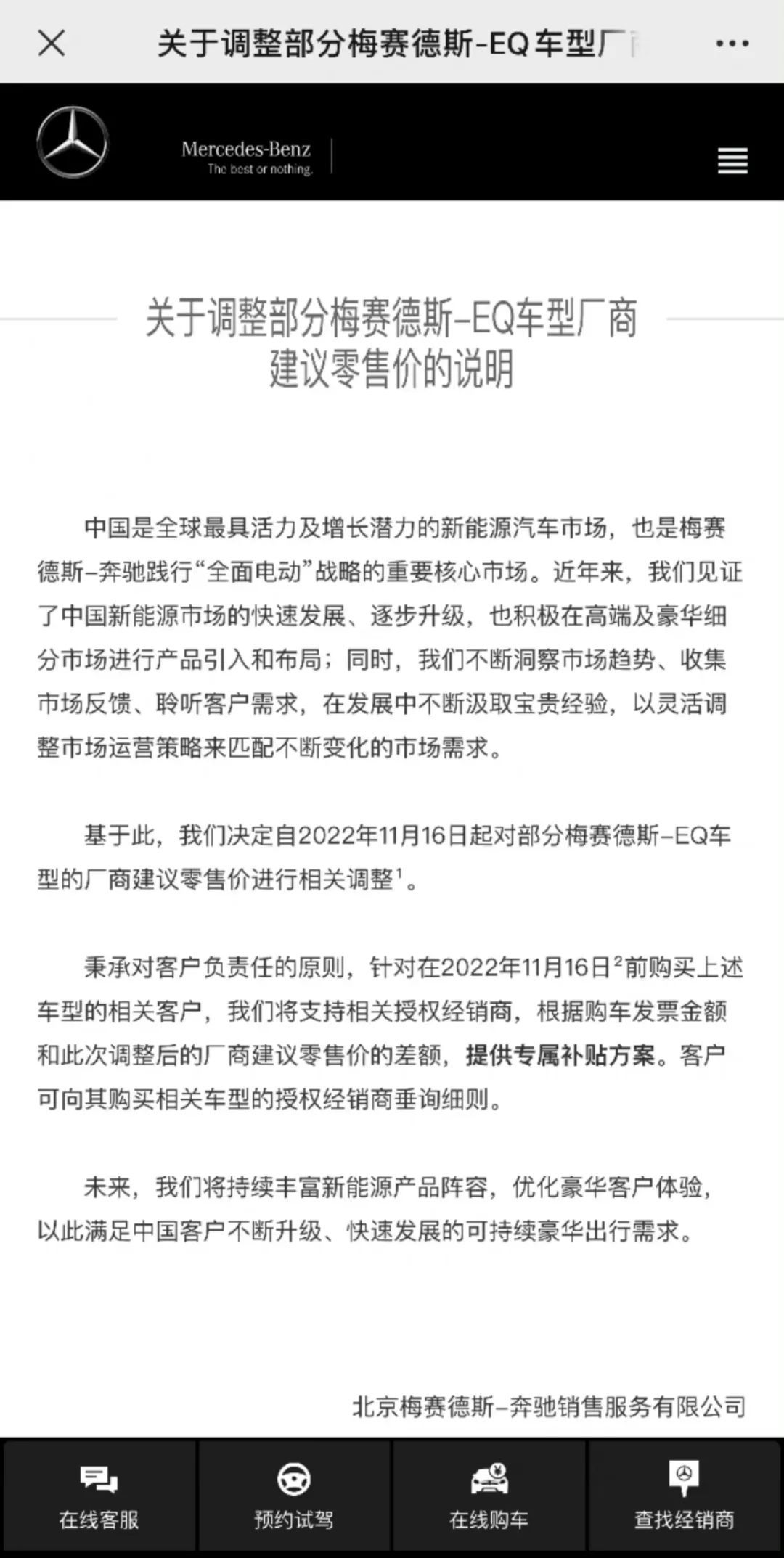 无独有偶,或许是碍于9月、10月的终端销量均未能破千,所以EQE进行了新一轮的“官降”,最新调整后EQE已经与自家燃油E级做到齐平。