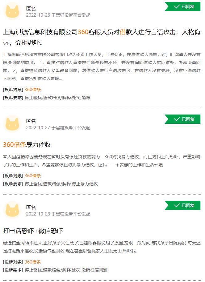 在近期的一则投诉中,借款人写道“本人因疫情原因债务现在暂时没有偿还贷款的能力,360对我暴力催收,而且对我上门恐吓,严重影响了我的工作和生活,希望能够停止对我暴力催收,还我一个安静的工作和生活环境。”