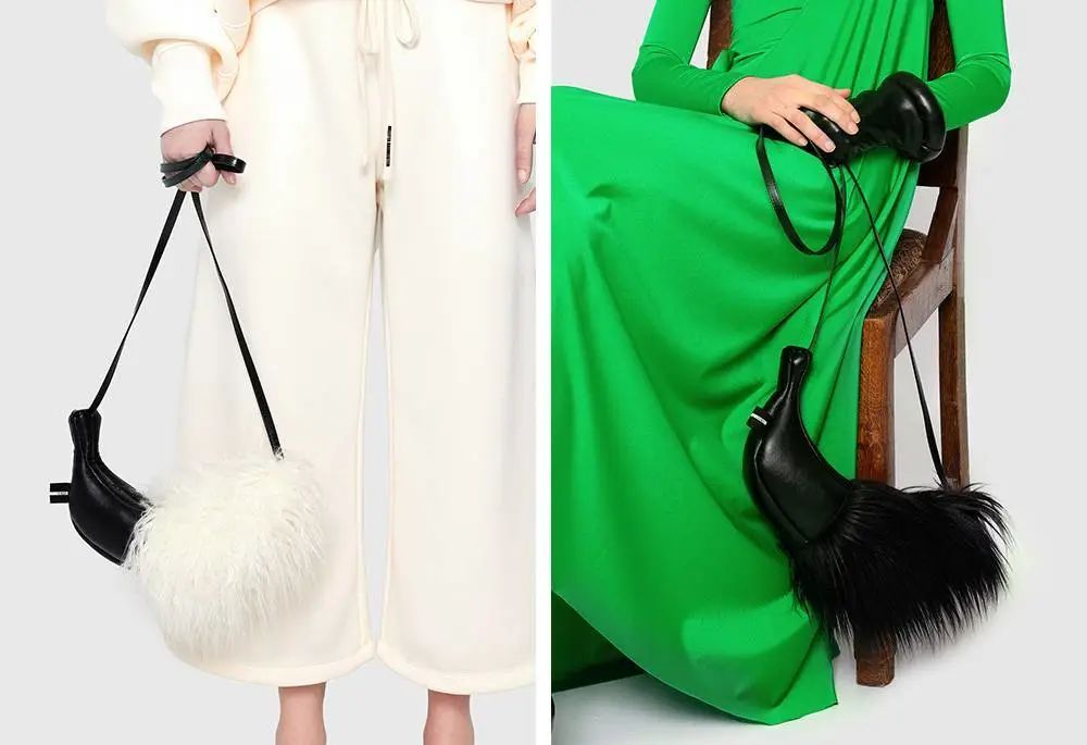 2021 年秋冬系列,香蕉包有了大胆的变化,香蕉的一半藏在了羽毛之中。不禁想问一句,这灵感还是香蕉吗?