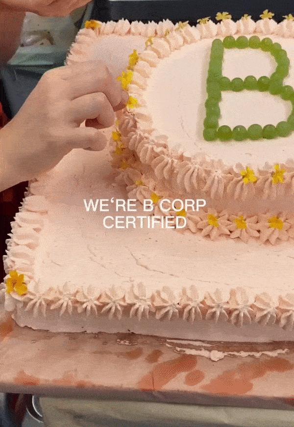 Ganni 还为这一次的认证通过订了个粉色蛋糕,上面用青葡萄拼出了一个大大的 B。