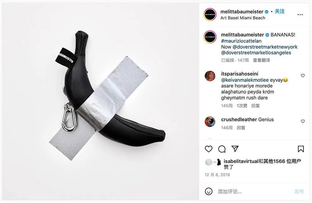 这个香蕉包比卡特兰用胶带和香蕉做的《喜剧演员》面世还要早上半年,因此在「天价香蕉」引起网络热议时, Melitta Baumeister 立马用自家的香蕉钥匙包做了个「同款」,地点还标记上「天价香蕉」的所在地迈阿密海滩。