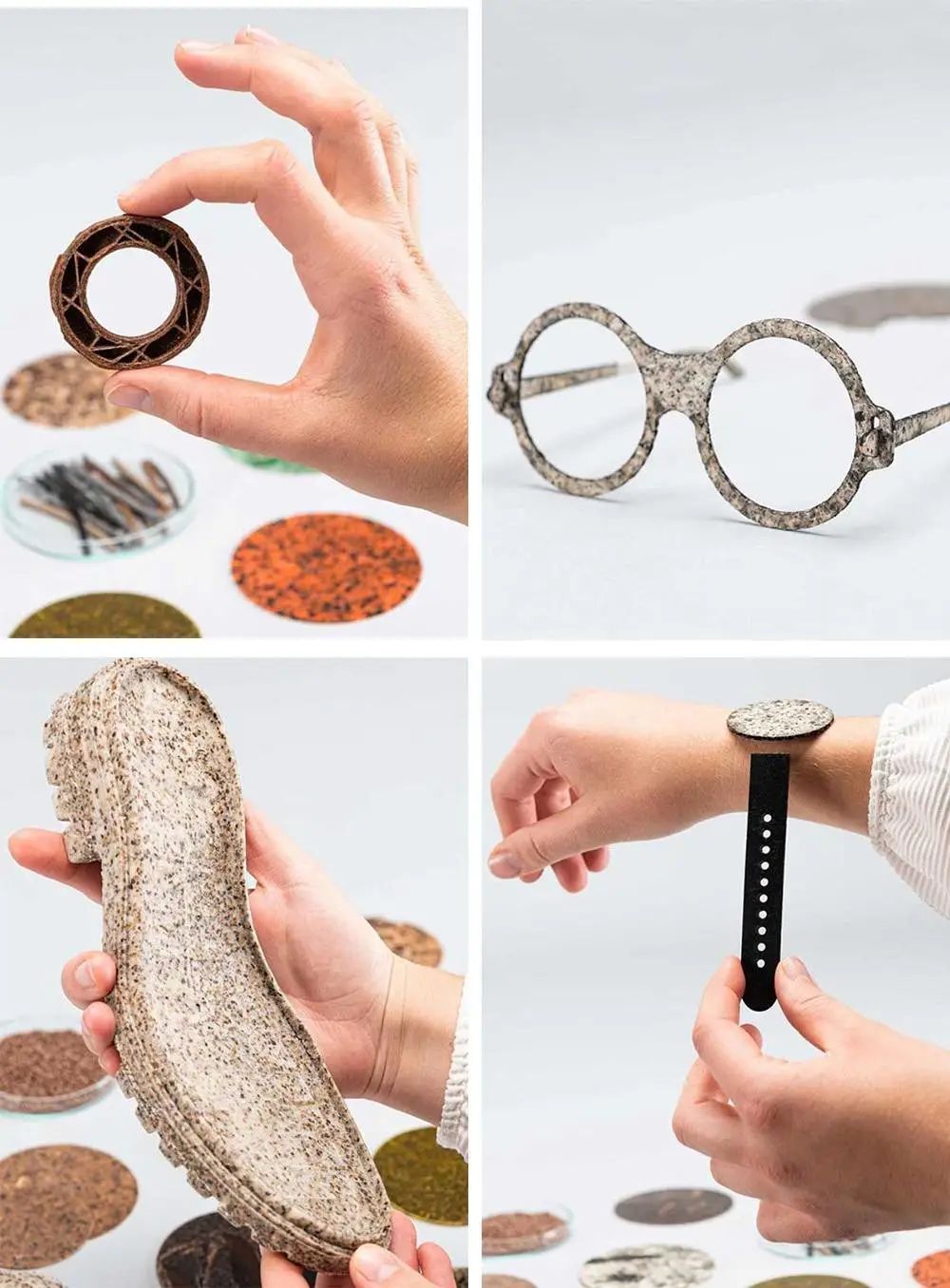 看到这一切的设计师 Sarah Harbarth,为此创建了名为 KUORI 的项目——将香蕉皮再造为可降解的环保皮革,并制作成眼睛架、鞋底、表带,还可以直接用作 3D 打印材料,可供打印成任何想要的物件。