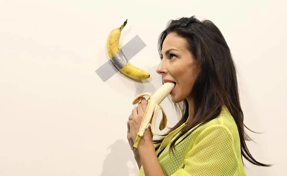 但「天价香蕉」,我们却会同时想到艺术家卡特兰的作品《喜剧演员》——明明是一根用银色胶带贴到墙上的香蕉,却在 2019 年 12 月的巴塞尔艺术展上卖出 12 万美元的天价,震撼程度堪比当年杜尚的马桶、安迪·沃霍尔的金宝汤罐头。