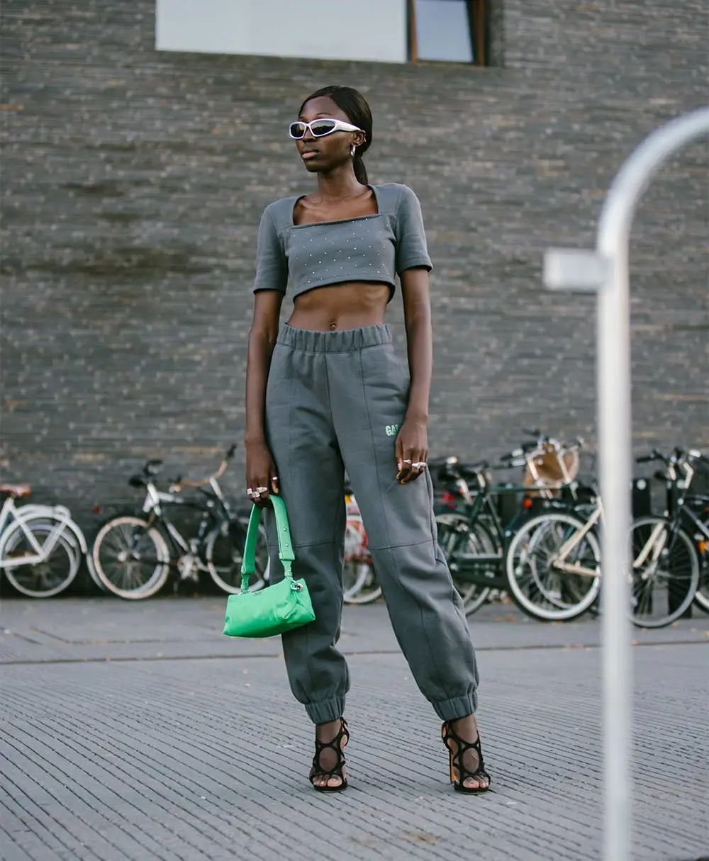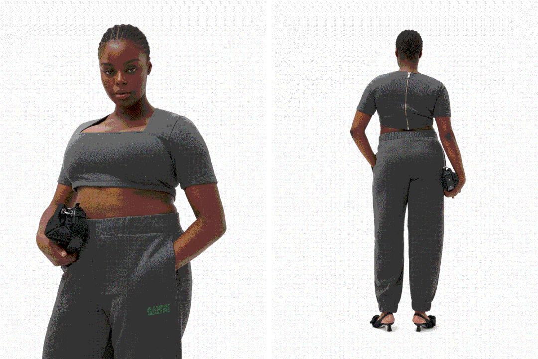 哪里想到,养了一大批少女粉丝的 Ganni,最近竟然花大成本做了三件灰不拉几的运动服,分别是一件方领露脐上衣、一件长袖连帽外套和一条运动裤,简直是绿色的品牌 logo 放上去都能算设计点的基本款。