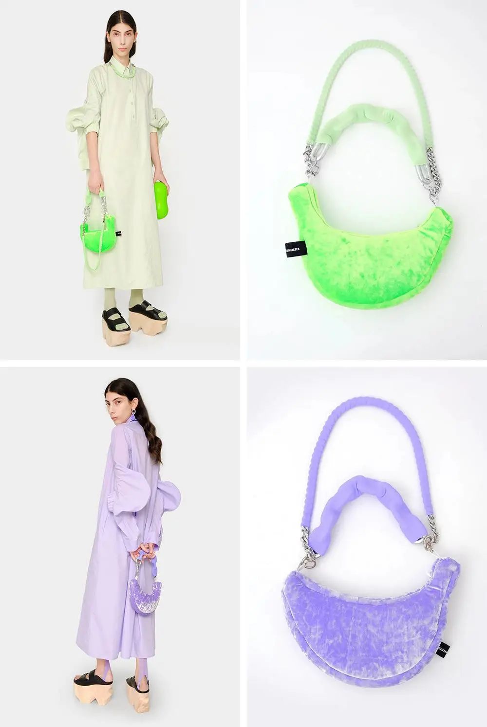 刚刚过去 2022 年春夏系列中,Melitta Baumeister 的香蕉包变可爱俏皮了——用上了荧光绿和浅紫色的丝绒制作,香蕉外形也不再走写实路线,更卡通化了。