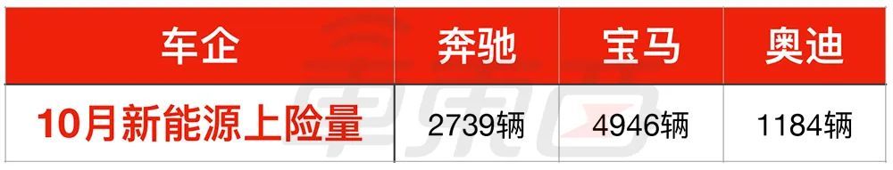 10月份上险量显示,奔驰宝马奥迪的新能源上险量都仅有几千台,甚至三家的新能源总销量加起来还没有其他车企一款车型上险量高。