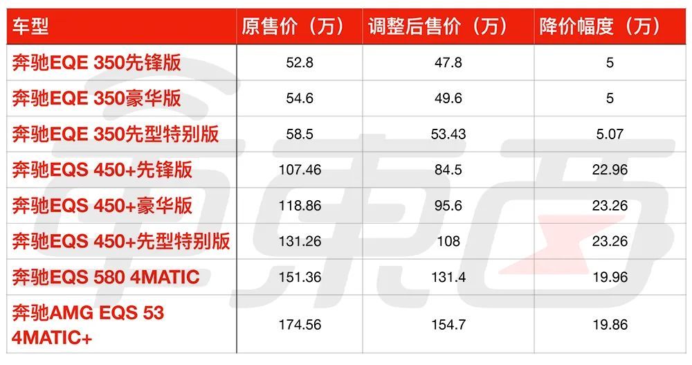 虽然此次降价只针对两款车型,分别是EQE和EQS,但具体来看,却影响到了8个车型版本,这其中,奔驰EQE的降价幅度基本上都都在5万元左右,而EQS的多个版本车型降价都在20万元左右。