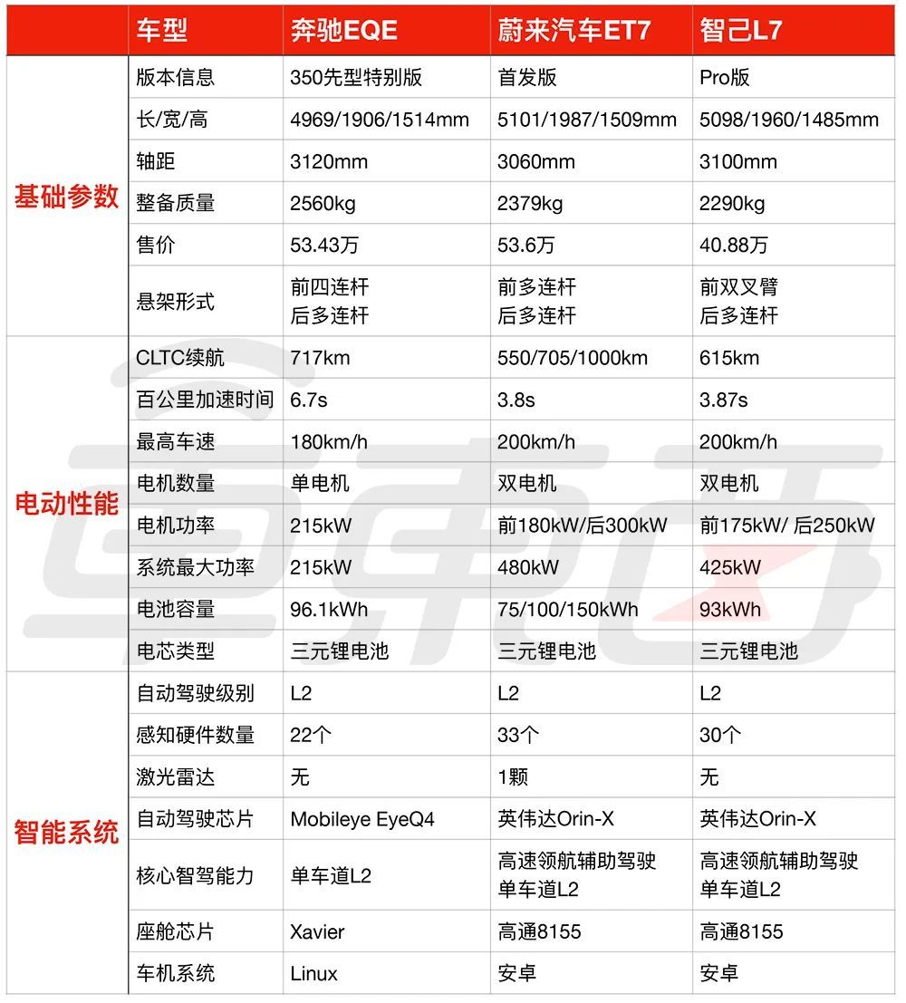 作为一款平均售价在在50万左右的纯电轿车型,这款车目前的竞争对手主要为蔚来ET7、智己L7等。车东西也对这两款车型性能参数做了一些对比,主要选择了其顶配版本,从表格中也可以看到一些信息。