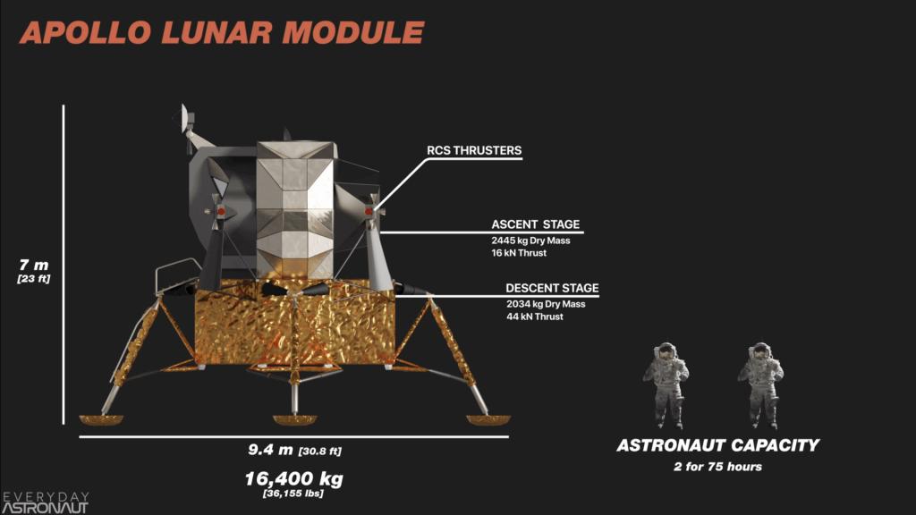 在阿波罗计划中的登月舱,由格鲁曼公司(Northrop Grumman)生产,高7米,腿伸出时宽9.4米,燃料充足时重达1.64万公斤。它可以携带两名宇航员到月球表面,并停留75小时。