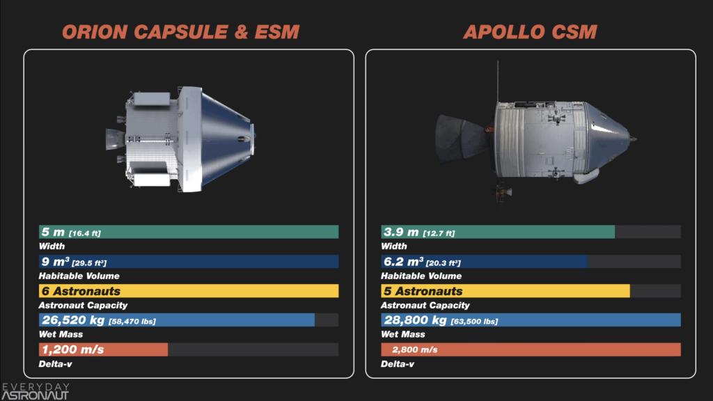 从太空舱看,猎户座倒是“赢麻了”——猎户座太空舱宽5米,阿波罗太空舱宽3.9米,猎户座的9立方米宜居空间,比阿波罗大了近50%,最多可搭载6名宇航员。