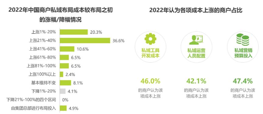 据艾瑞咨询统计,2022年布局私域的商户中,超80%的比例认为私域成本较布局之初有所上涨,且多数认为成本上涨幅度为21%-40%(36.6%)、1%-20%(20.3%),且上述成本的上涨主要被用作私域工具的开发、私域运营人员的配置、以及私域营销做出的预算投入。