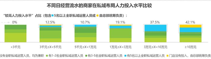 在人员配置方面,艾瑞咨询的统计显示,人力投入的成本与商家经营效果高度正相关。具体来说,当日经营流水低于3k-5k元时,商家只需考虑兼职零工或1-2名正职就可以高效促成私域经营;当日经营流水在5k-30k时,商家需要加大对正职人员的投入(往往在5名及以上);当日经营流水高于30k时,商家不仅需要增加正职,还需要由总部统筹。
