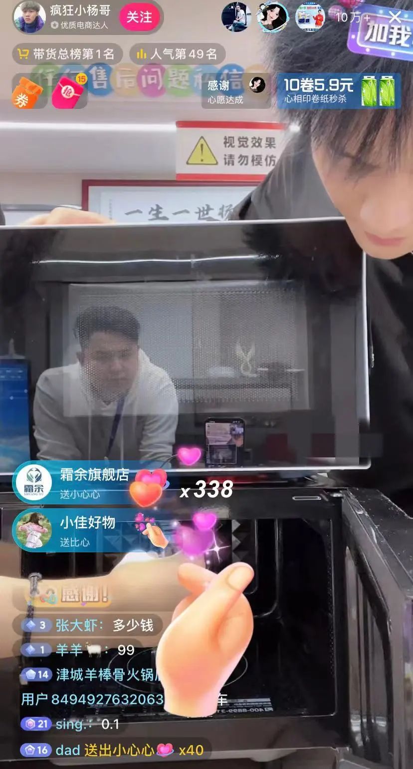 就在遭遇王海打假的这天晚上,11月15日,疯狂小杨哥在抖音的直播间跟平常一样带货。遇到一款微波炉内灯时亮时不亮的时候,疯狂小杨哥丝毫不给品牌方面子的来了一句“哎,不亮了”。此时的直播间响起了仿佛情景喜剧的哄堂大笑声。