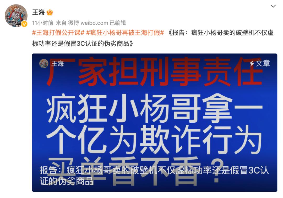 刚成为抖音首个粉丝破亿网红没几天,疯狂小杨哥就遭到了打假人王海的举报。