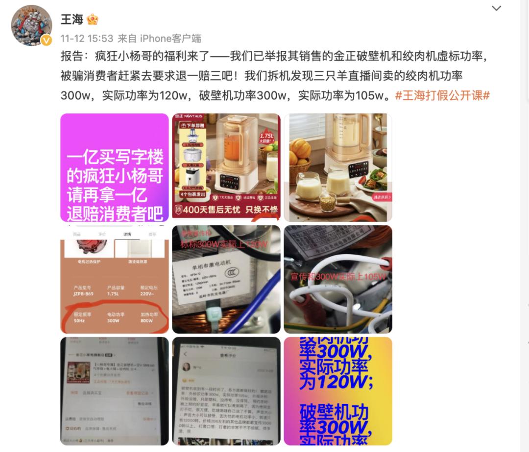 11月12日,王海在微博发布报告称,疯狂小杨哥的“三只羊”直播间售卖的金正破壁机和绞肉机均为虚标功率,绞肉机标注功率300W,实际功率只有120W,破壁机标注功率为300W,实际仅为105W。