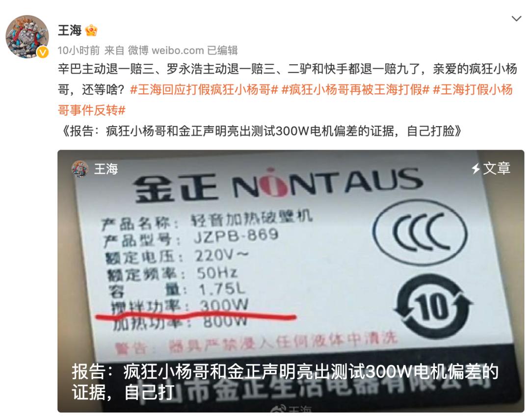 但是这份澄清声明再次遭遇王海打假,直言“厂家和疯狂小杨哥是在继续忽悠”,并在15日晚间再次发布一份“疯狂小杨哥和金正自己打脸”的报告,直言金正电器所言的“整机额定功率”一说不存在,金正声明称整机的额定功率300W,但是未给出相应的检测报告或测试报告。