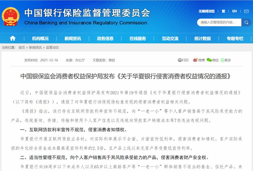 早在去年年末,华夏银行就被银保监会通报了7类违法违规问题。
