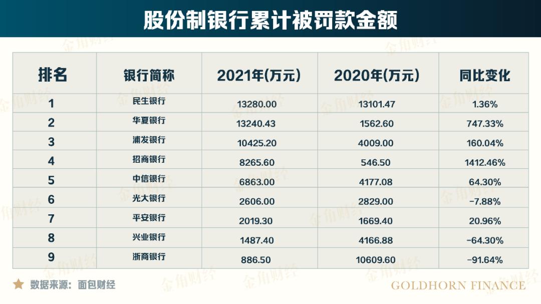 去年的罚金,在股份制银行中排名第二,比2020年增长了747%。