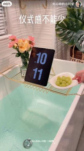 然后往浴缸里放水,洒上香香的、直男搞不懂是什么的液体,美美地泡个澡,浴缸上当然要有支架,小平板可以放上去。