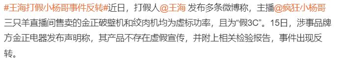 王海在文中说道:“这意味着疯狂小杨哥卖的这款金正破壁机不仅虚假宣传,属于以次充好的伪劣商品,还是假冒/冒用3C认证的产品。”