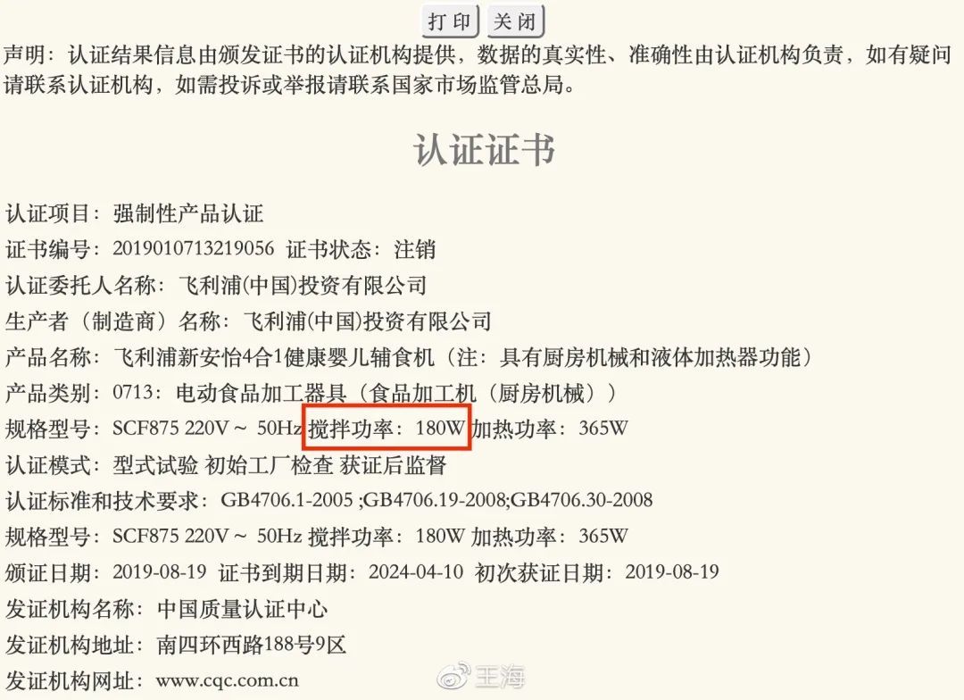 王海继续以飞利浦那款婴儿辅食机举例,其3C证书显示搅拌功率为180W,产品铭牌标示电机功率同为180W。他认为,以飞利浦的品牌知名度和发证机构中国质量认证中心的权威性足以说明问题。