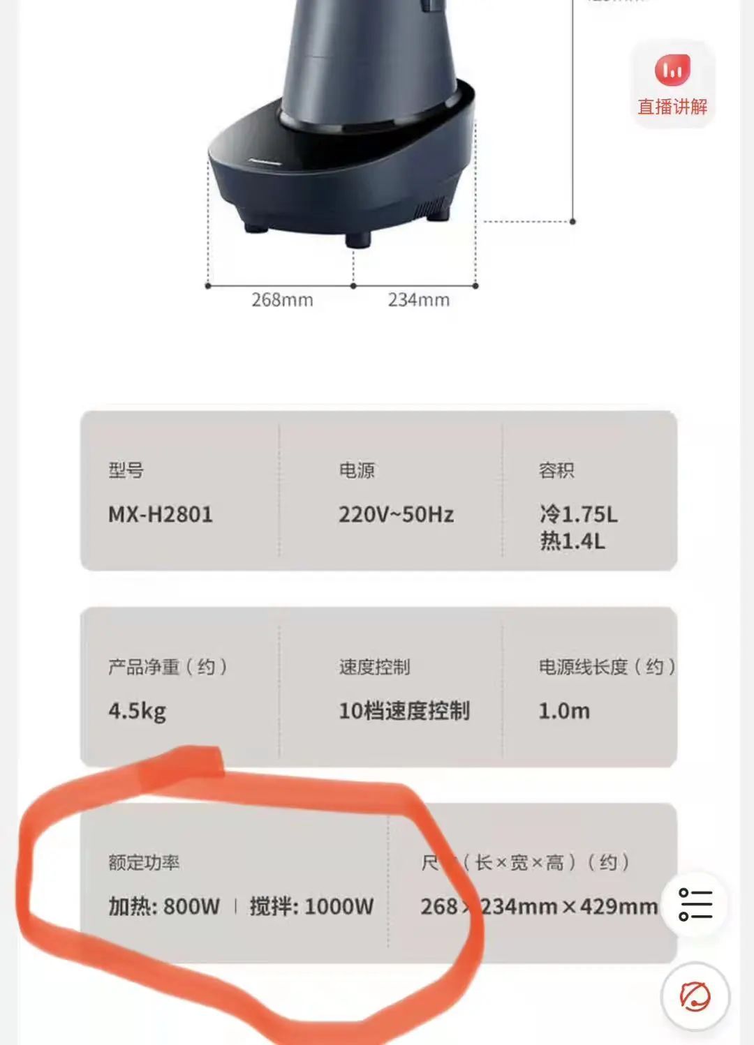 他又以松下的一款破壁机为例,其宣传电机功率1000W,标示额定功率为搅拌功率1000W。