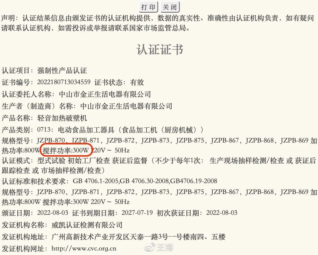 目前双方各执一词,究竟是“电机功率与产品整机的额定功率是不同概念”,还是如王海所说“搅拌功率就是指搅拌的电机功率”,金正生活电器有没有如王海质疑的那样,疯狂小杨哥卖所售破壁机冒用了同厂产品的3C认证欺骗消费者,尚待权威部门认证。