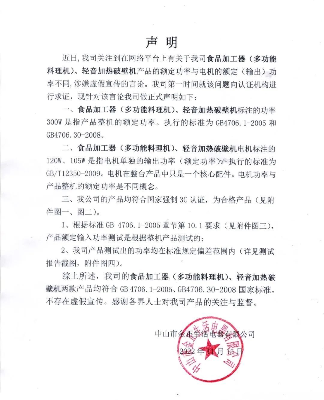 15日当日,疯狂小杨哥所售产品的品牌方金正生活电器发布声明回应“王海打假小杨哥”一事,并附有3C认证证书和检测报告。