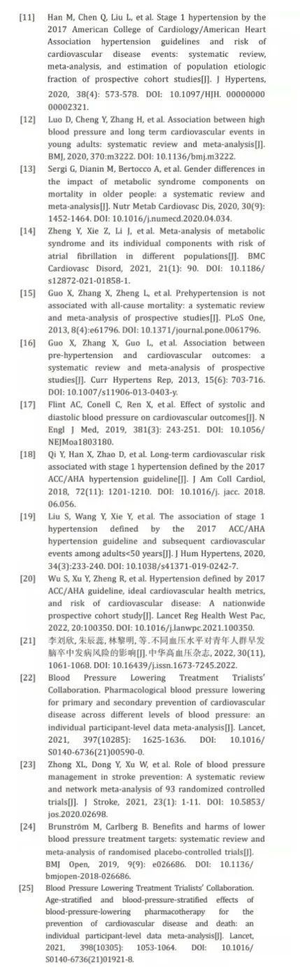 同时,该指南认为临床试验证据支持对符合 130/80mmHg 标准的人群进行降压治疗,能对心血管病风险产生显著改善。主要依据为汇总多个临床试验的最新荟萃分析结果的支持(原文文献 22~25)。