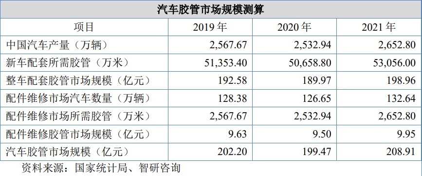 新能源汽车销售的大规模增长,为汽车胶管行业提供了新的发展机遇。根据智研咨询预测,2019-2021年,我国汽车胶管市场规模分别为202.2亿元、199.47亿元、208.91亿元。