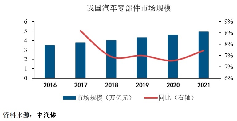 根据招股书显示,公司所属领域为汽车零部件行业。在我国汽车行业高速发展的背景下,我国汽车零部件行业迅速发展。根据中汽协数据,我国汽车零部件的销售收入从2016年3.46万亿元增长到2021年的4.9万亿元,年复合增长率达 7.21%。