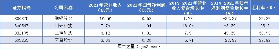 业绩方面,2019年-2021年,公司营业收入分别为5.26亿元、5.67亿元、6.12亿元,近2年复合增长率为7.9%;归母净利润分别为3629.78万元、4465.04万元、8100.95万元,近2年复合增长率为49.39%。