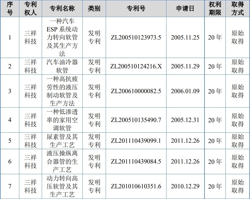 自公司成立以来,公司高度重视车用胶管产品生产工艺和配方技术的研究。截至招股书签署日,公司已拥有授权专利134项。其中发明专利23项、实用新型专利111项。