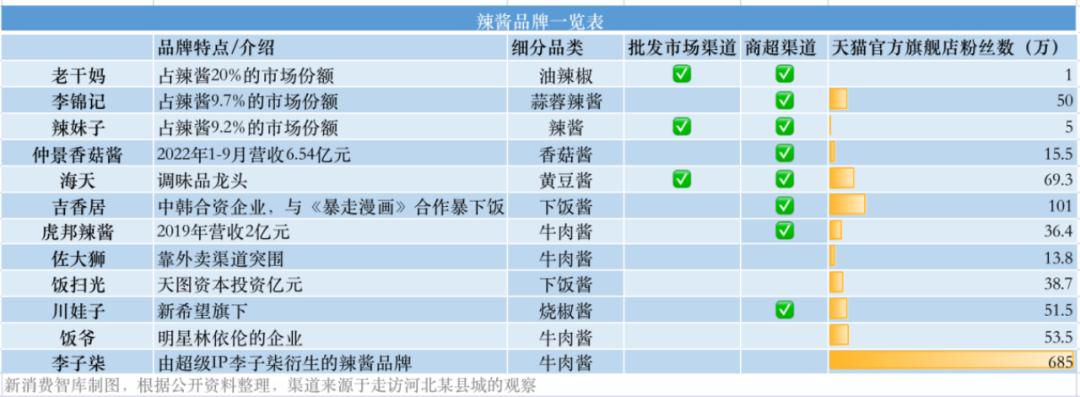 此外,新消费智库在河北某县城走访了批发市场、商超,并参考了天猫和公开资料,总结了一些有一定知名度的辣酱品牌。