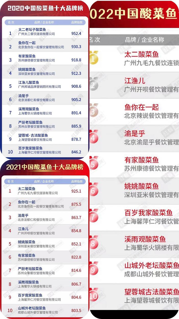 根据市场综合数据显示,太二酸菜鱼一直高居酸菜鱼十大品牌之首;今年品牌排名第二的江渔儿从2020年第五上升而来;鱼你在一起则稳居三年前三甲之位。其中,太二酸菜鱼与江渔儿属于正餐领域,而鱼你在一起和渝是乎则主打快餐招牌。