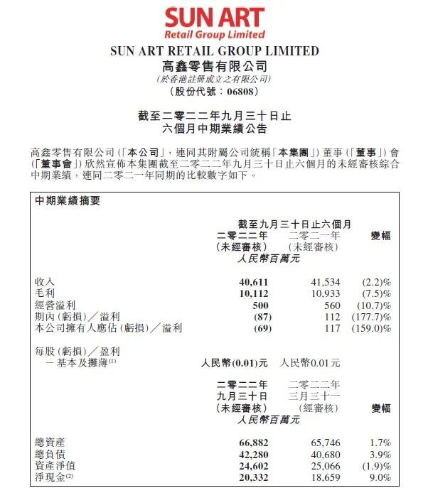 11月15日晚间,大润发上市母公司高鑫零售发布了截至9月30日的2023财年上半年业绩报告,实现营收406.11亿元,同比下滑2.22%;归属上市公司股东的应占净利润为-0.69亿元,和去年同期1.17亿元的净利润水平相比,大幅下滑158.97%。