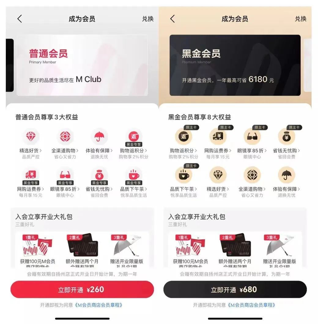 M会员商店的付费会员有两种:一是普通会员,年费260元;二是黑金会员,年费680元。