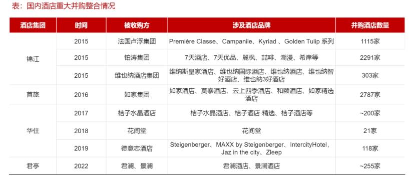 2015年以来,国内酒店市场并购提速,锦江、华住、首旅等酒店集团通过并购快速提高集团的市场份额,同时通过并购优质品牌,打造了多元的品牌矩阵,完善公司酒店产品的价格带。疫情爆发后,单体酒店大幅出清,酒店集团凭借“钞能力”迎来提升市场份额的历史性机遇。锦江、首旅、华住拓店数量均超过疫情之前水平。