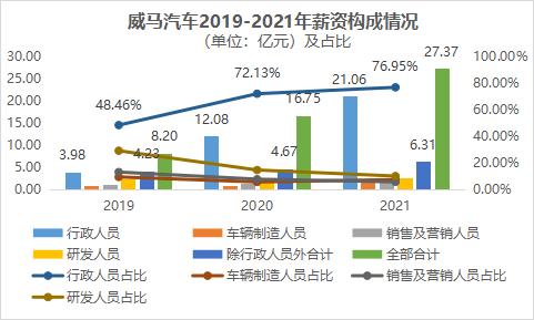 最后要谈的是前一段时间大家最关心的“董事长薪酬”问题。根据行政费用中的雇员薪酬显示,威马2019-2021三年行政人员的薪资增长越来越快,分别是3.98亿元、12.08亿元和21.06亿元,同比增速69.0%和77.9%。而相较之下汽车制造、销售及研发人员的薪资增速仅为3%左右、15%左右和26%左右。同样的,行政人员薪酬占比也越来越高,两年间就从48.46%涨了几乎一半,高达76.95%。
