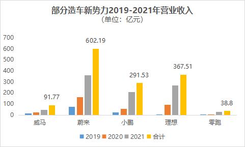 一个企业资金的来源主要有内部经营产生和外部融资。从内部经营情况来看,威马招股书披露,近三年来的营业收入分别为17.62亿元、26.72亿元和47.43亿元,其中2020、2021年的同比增长率达到了51.62%和77.51%。但从合计营收这项看,威马已经有了掉队的迹象:近三年其合计营收达91.77亿元,与“蔚小理”三家差距明显,甚至不足第三名小鹏汽车的三分之一。