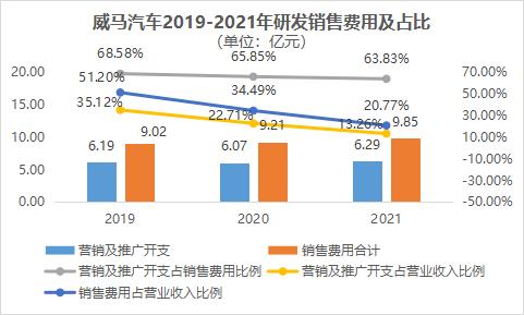 除了研发和制造以外,营销也是一个造车新势力重要的支出部分。威马的销售费用组成结构和变化与研发开支类似,三年的营销及推广支出占销售费用的65%上下,但是随着营业收入的增加,其占比也随之下降。