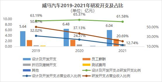 在研发投入上,威马的脚步显得停滞不前。2019-2021三年的研发开支为8.93亿元、9.92亿元和9.81亿元,其中最主要的研发科目——设计及开发开支这三年基本没有什么增长,为5.64亿元、6.48亿元和6.04亿元,占研发开支比例的63.19%、65.37%和61.58%,但是随着营收的增长,其占营收的比例从32.02%直线下跌到了12.74%。
