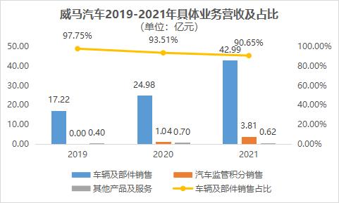 从业务构成看,威马主营的车辆及部件销售业务在近三年占据了相当高的比例,分别达到了97.75%、93.51%和90.65%。随着车辆销售规模的增加,威马获得的新能源汽车积分也越来越多,由此给2021年带来3.81亿元收入。