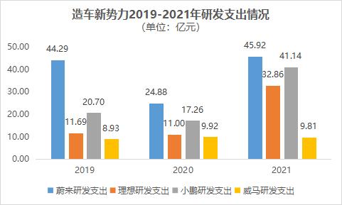 横向对比来看,“蔚小理”三家的研发支出都超过了30亿元,其中小鹏和理想在2021年研发投入同比增长均超过100%;蔚来虽然没有明显增长,但是奈何投入的基数大,仅2019年的研发投入就超过了其他三家之和。电动化与智能化同步进行,对造车新势力来说,技术就是最强的生产力。就像长跑中的加速度,研发一旦落后了,企业的发展便会以几何倍数的速度的落后。本是同一起跑线上的对手,可能连车尾灯都看不到了。