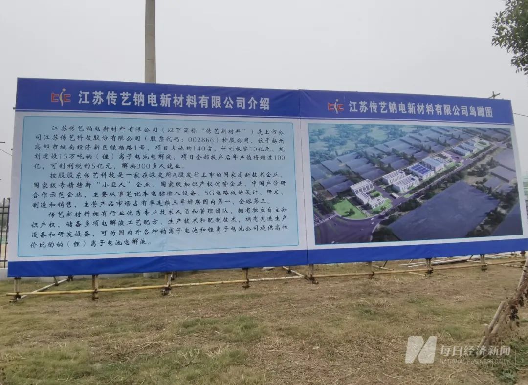 11月10日,《每日经济新闻》记者实地走访了位于江苏高邮的传艺科技及旗下公司传艺钠电。现场标牌显示,传艺钠电项目占地约140亩,计划投资10亿元,规划建设15万吨钠(锂)离子电池电解液。