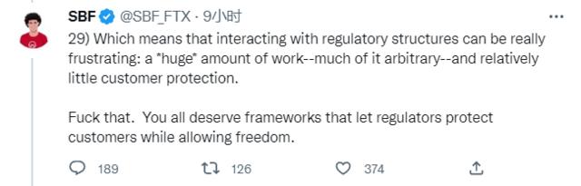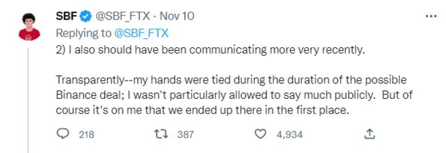 11月16日,他又发推特声称:“我唯一的目标,就是让客户满意。我正在尽我所能做到这一点。我将亲自与监管机构会面,并与各团队合作,尽我们所能为客户服务。在那之后,还有投资者。但首先是客户。”