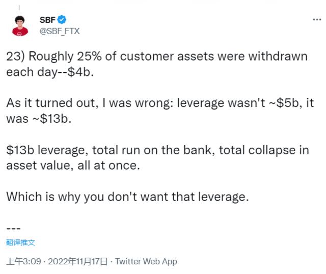 他表示,FTX的杠杆不是50亿美元,而是130亿美元——他犯了一个80亿美元的错误。